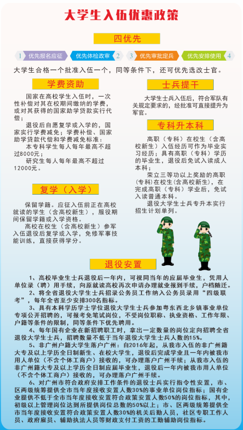 国家针对大学生入伍制定了一系列优惠政策,包括:优先录取、优先安排专业、优先提干、优先评定职称等,还为入伍大学生提供奖学金、助学金、贷款减免等经济支持。