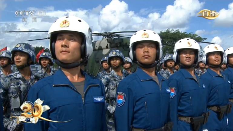 视频直播首先展现了驻港部队的列队情况,部队官兵精神饱满,步伐整齐,口号响亮,他们身着迷彩服,佩戴武器,展示了威武的军容。