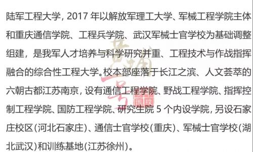 3、就业方向:毕业生将面向军队各级岗位就业,为国防事业贡献力量,也可选择到地方企事业单位、科研机构等单位就业。